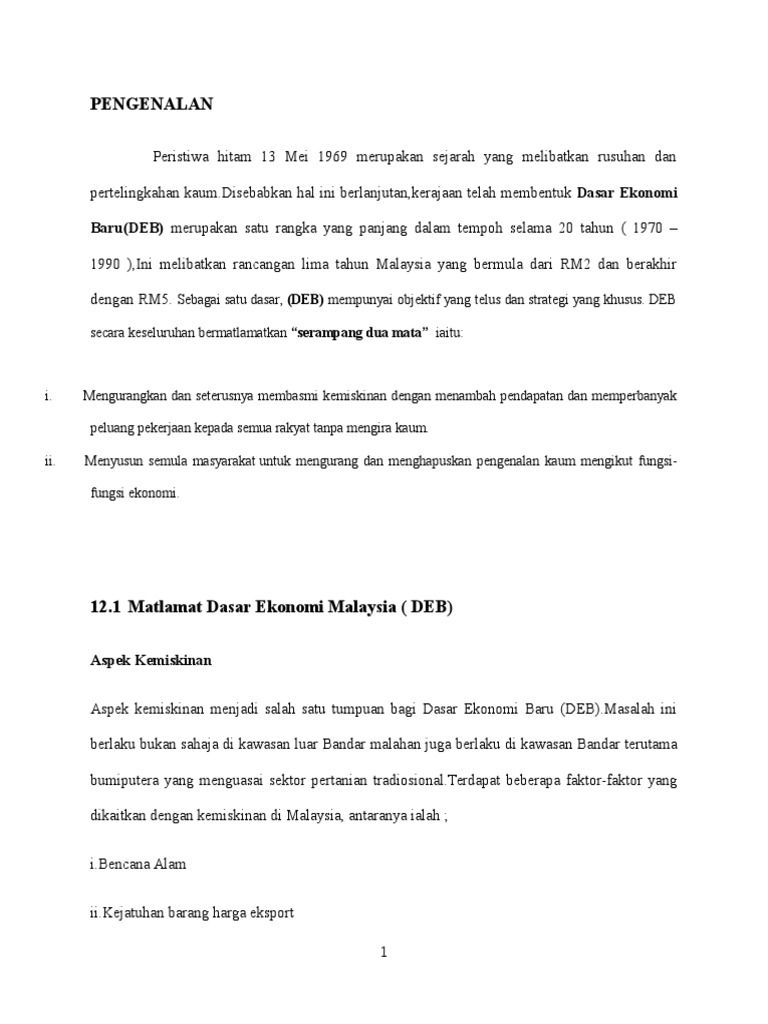 • pelancaran dasar ekonomi baru pada tahun 1971 merupakan sejarah pelan ekonomi malaysia.• deb menekankan pencapai sasaran sosio ekonomi seiring dengan mencapai objektif perkembangan ekonomi sebagai satu cara mewujudkan keharmonian dan perpaduan di dalam negara yang. Berikutan dengan rusuhan kaum ini, kerajaan telah mengambil tindakan tegas bagi mengkaji semula matlamat. Read reviews from world's largest community for readers. Dasar ekonomi baru dasar ekonomi baru merupakan satu bentuk perancangan yang dilancarkan oleh kerajaan dalam tahun 1970 melalui rancangan malaysia kedua. Dear tun dr m, dasar ekonomi baru was developped by a team of bumiputra intellectuals during the early 70s.